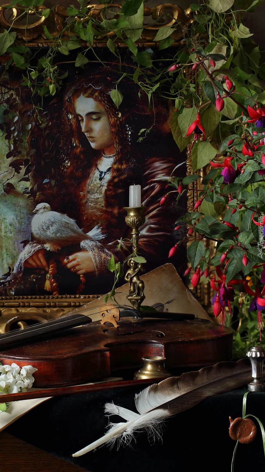 Edytor tapety: Skrzypce i fuksja obok obrazu