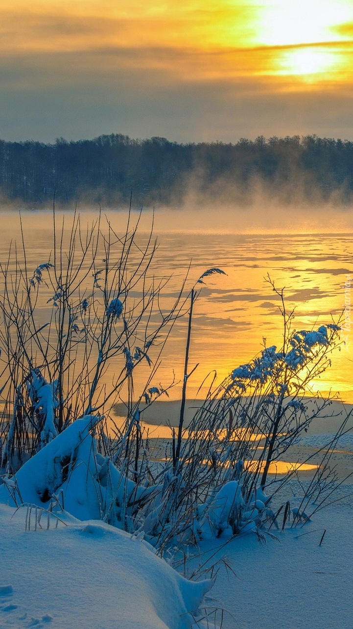 Edytor tapety: Ośnieżone trawy nad brzegiem jeziora