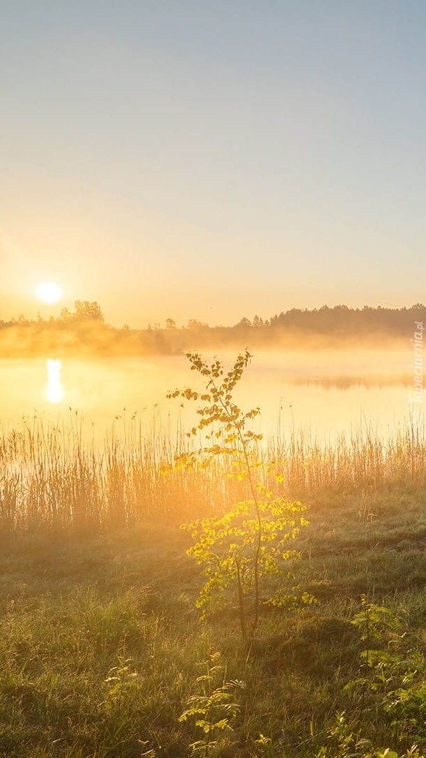 Edytor tapety: Poranek nad zamglonym jeziorem