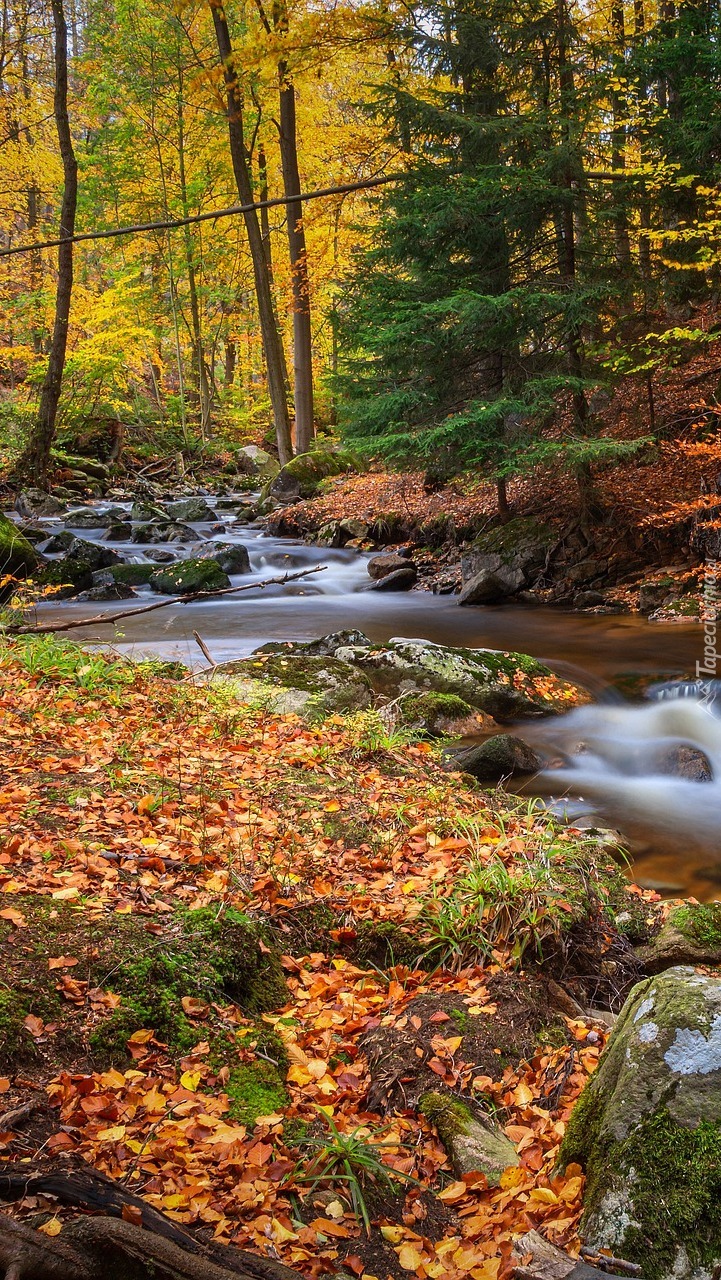 Edytor tapety: Opadłe liście przy leśnej rzece