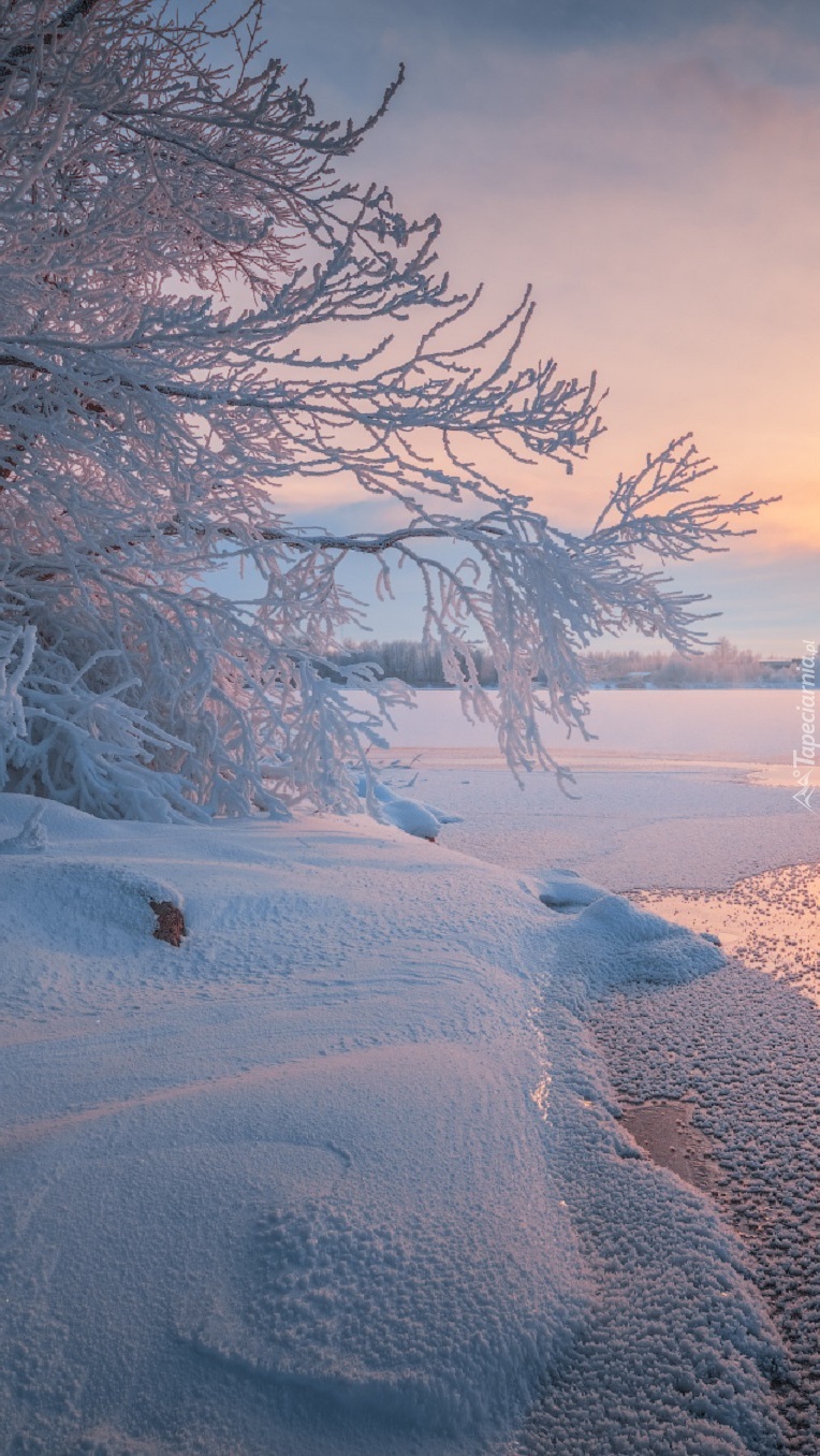 Edytor tapety: Krzewy w śniegu nad zaśnieżonym jeziorem