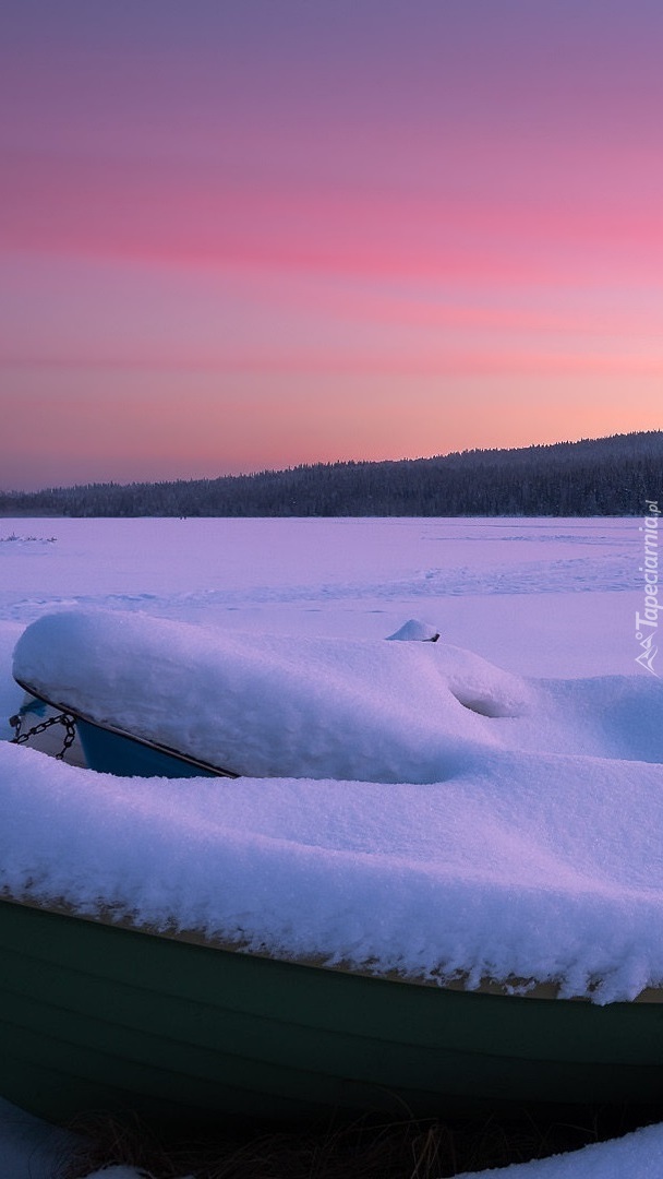 Edytor tapety: Zasypane śniegiem łódki i jezioro
