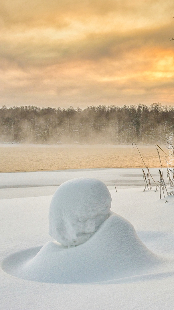 Edytor tapety: Ośnieżone krzewy i mgła nad rzeką