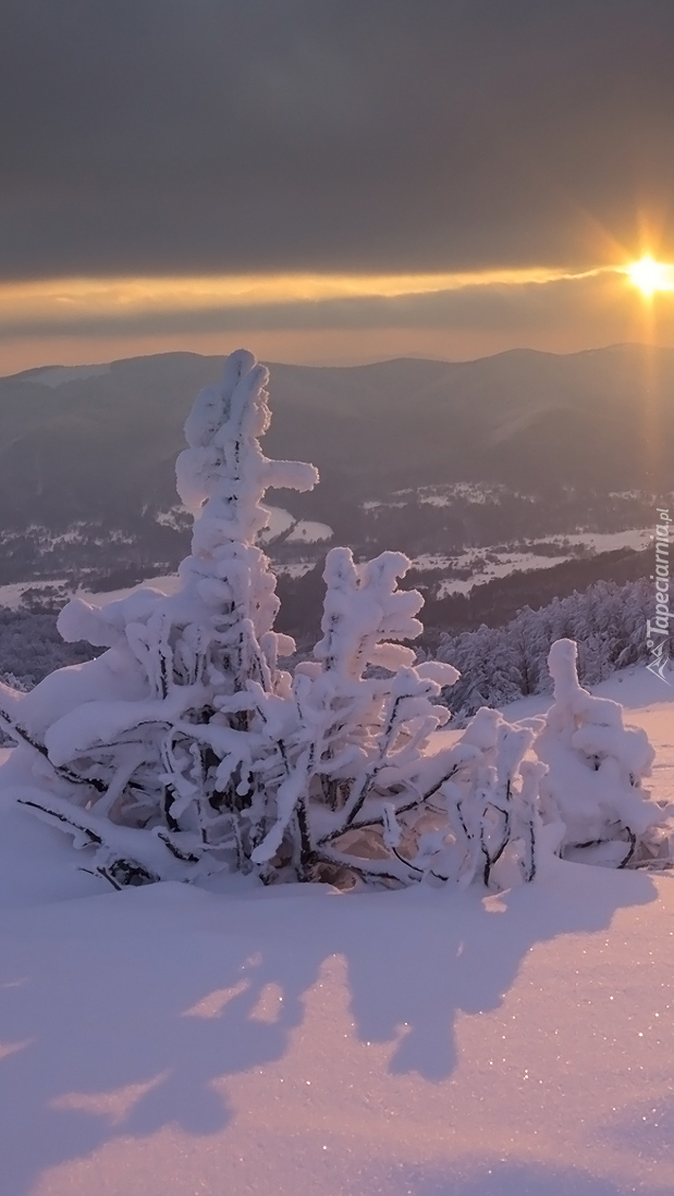 Edytor tapety: Ośnieżone krzewy w promieniach słońca