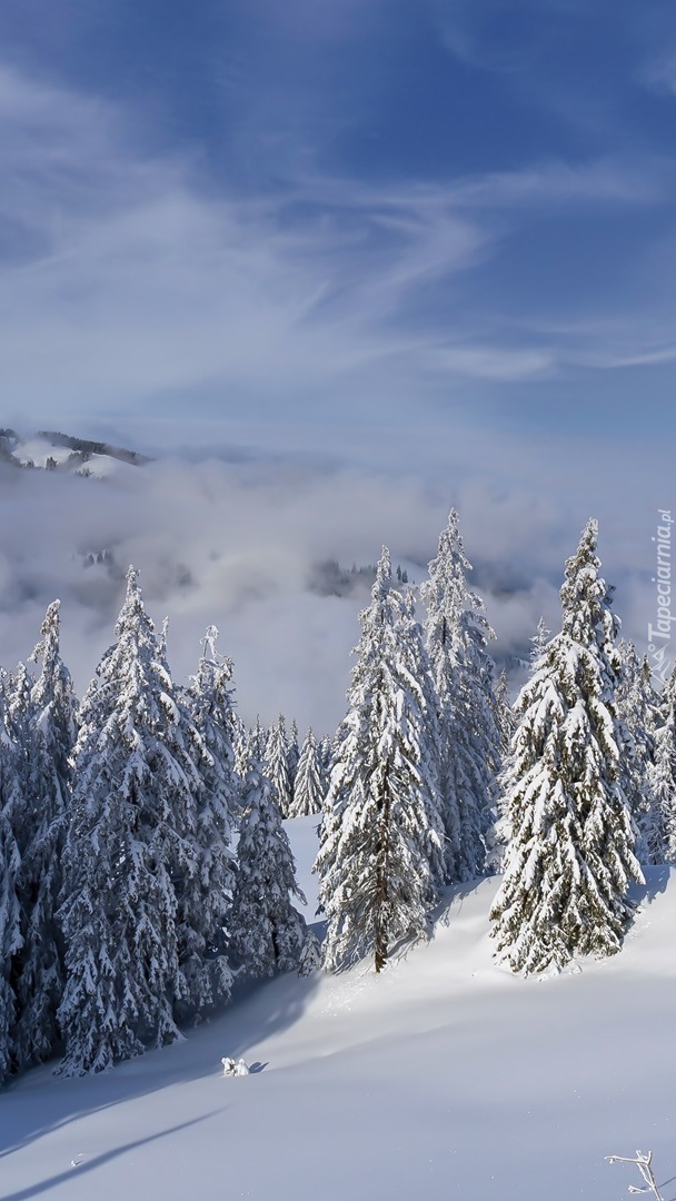 Edytor tapety: Ośnieżone drzewa na tle mgły