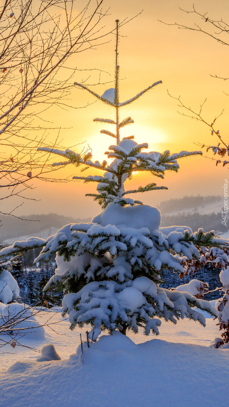 Edytor tapety: Ośnieżone drzewo w zachodzącym słońcu