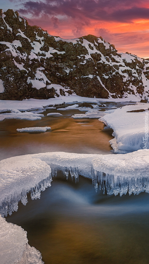 Edytor tapety: Sople na ośnieżonych brzegach rzeki
