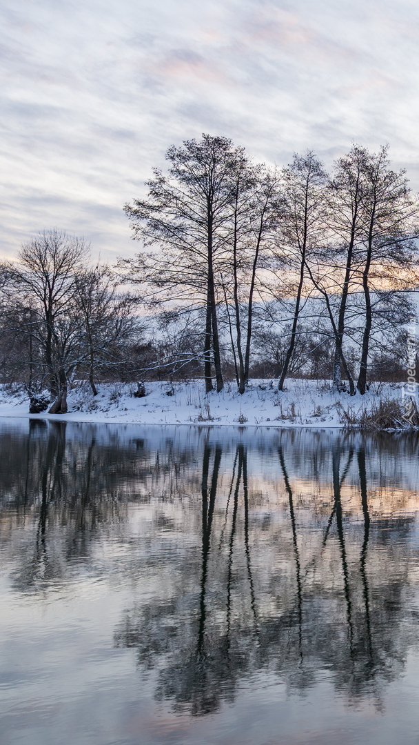 Edytor tapety: Drzewa w śniegu na brzegu jeziora