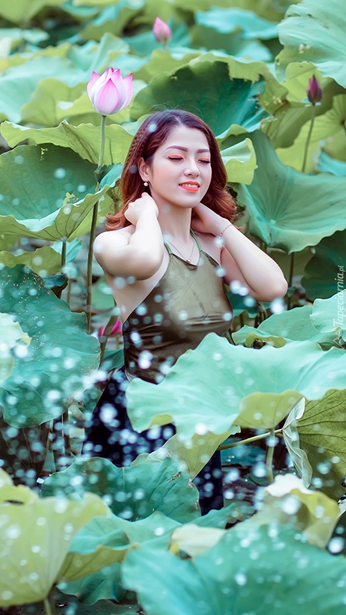 Edytor tapety: Azjatka wśród liści i kwiatów lotosu