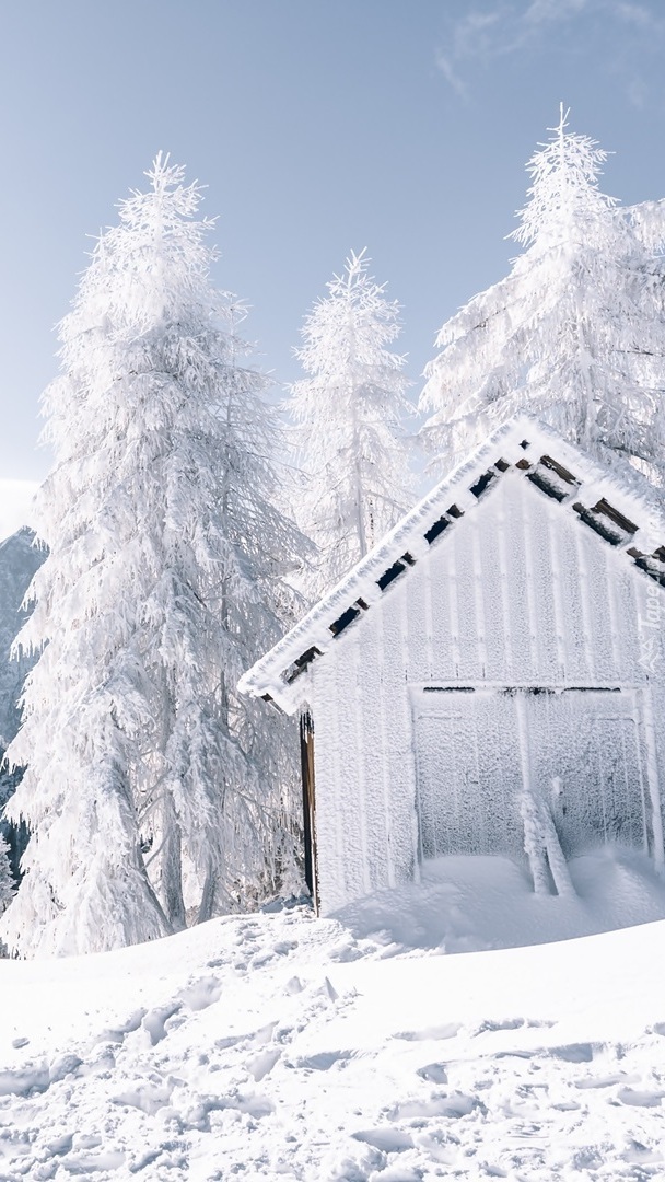 Edytor tapety: Ośnieżona szopa i drzewa