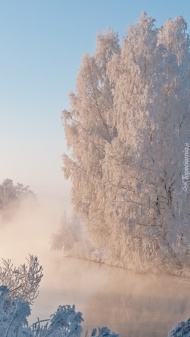 Edytor tapety: Oszronione drzewa nad zamgloną rzeką