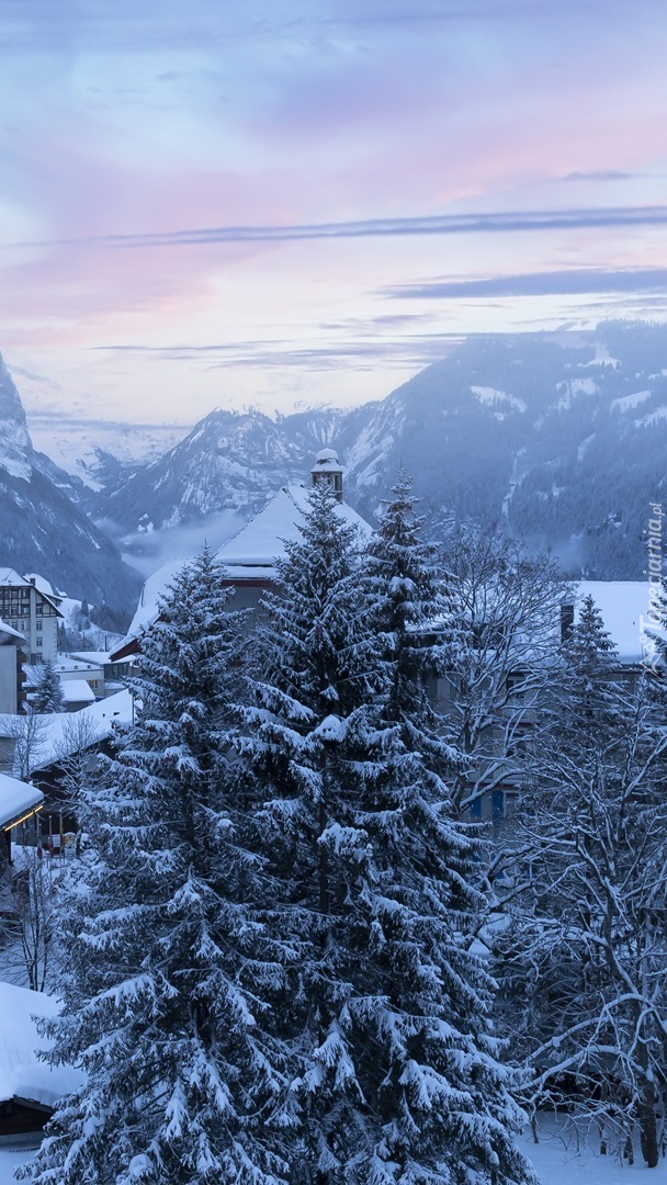 Edytor tapety: Ośnieżone drzewa i dachy domów