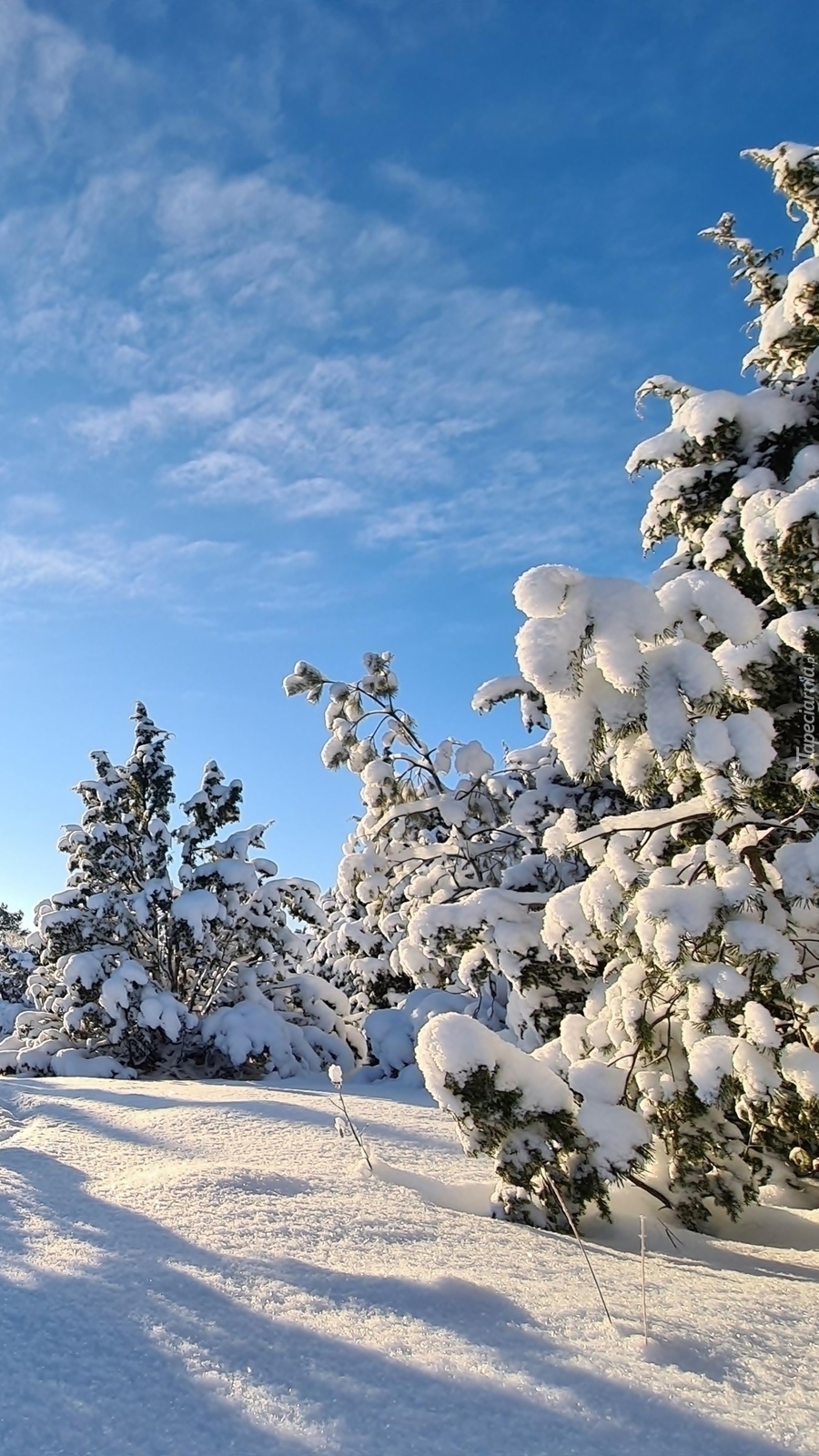 Edytor tapety: Ośnieżone drzewa w słonecznym blasku