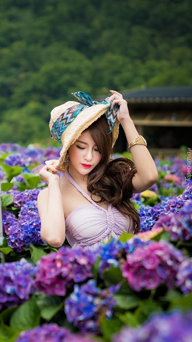 Edytor tapety: Azjatka wśród kwiatów hortensji