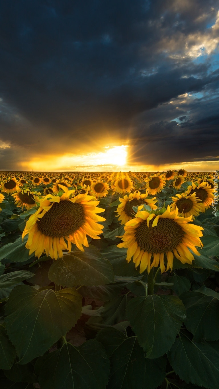 Edytor tapety: Plantacja słoneczników o zachodzie słońca