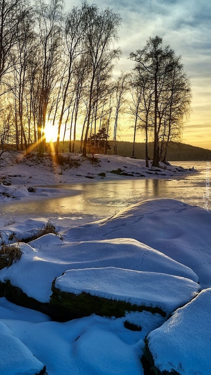 Edytor tapety: Brzozy nad zamarzniętym jeziorem