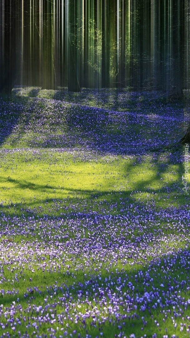 Edytor tapety: Liliowe krokusy na leśnej łące