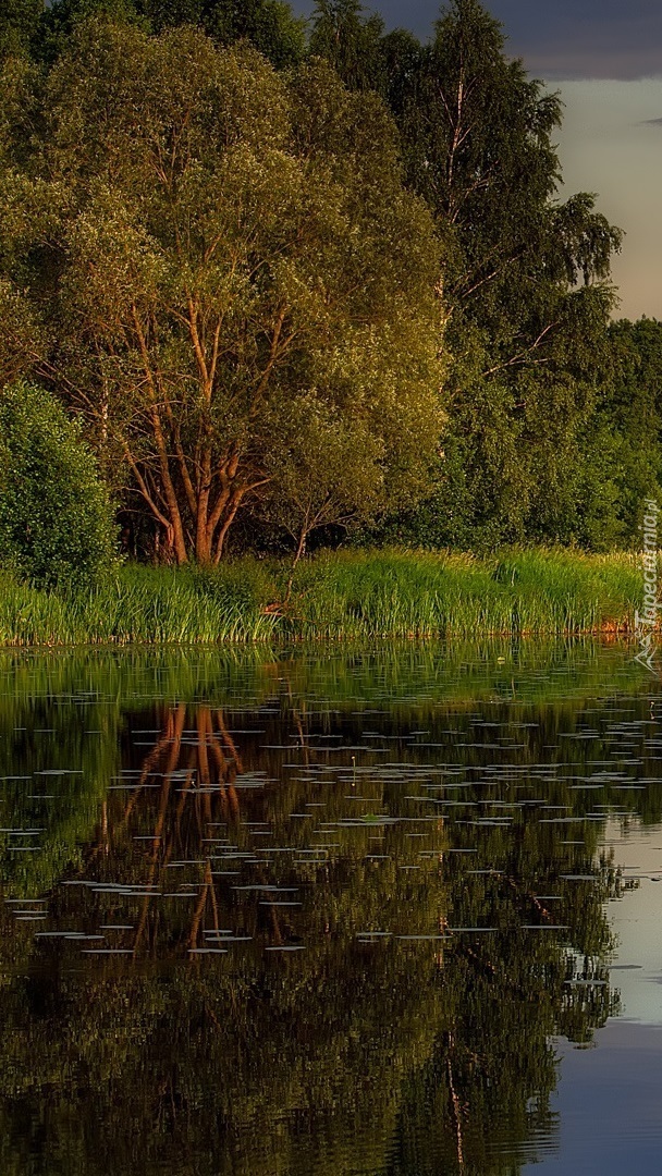 Edytor tapety: Szuwary i drzewa nad jeziorem