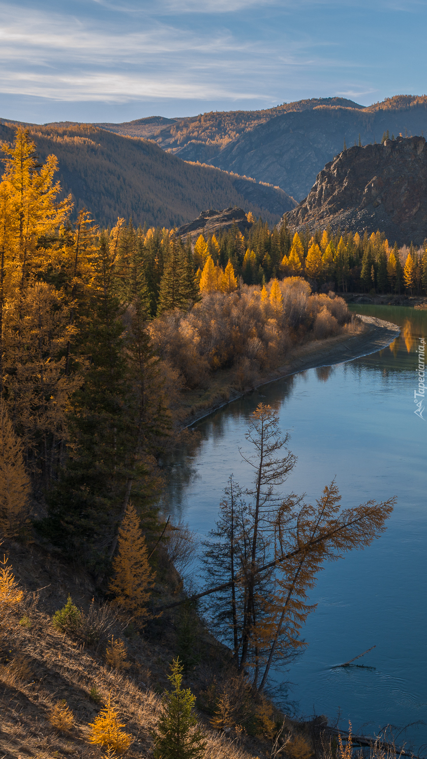 Edytor tapety: Pożółkłe drzewa nad górskim jeziorem