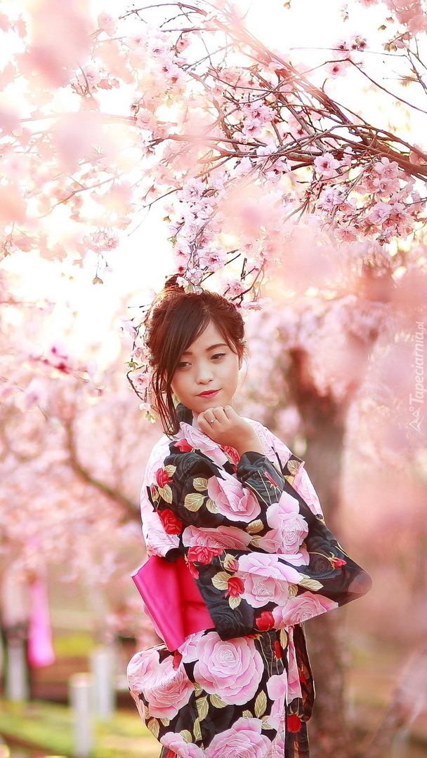 Edytor tapety: Azjatka przy okwieconym drzewie