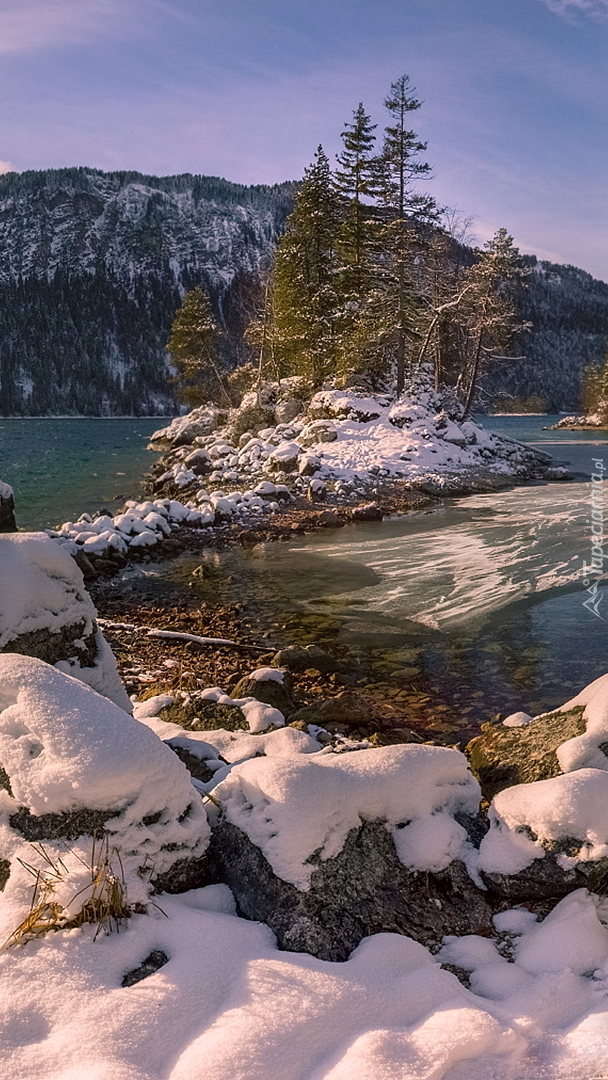Edytor tapety: Ośnieżone kamienie nad jeziorem Eibsee