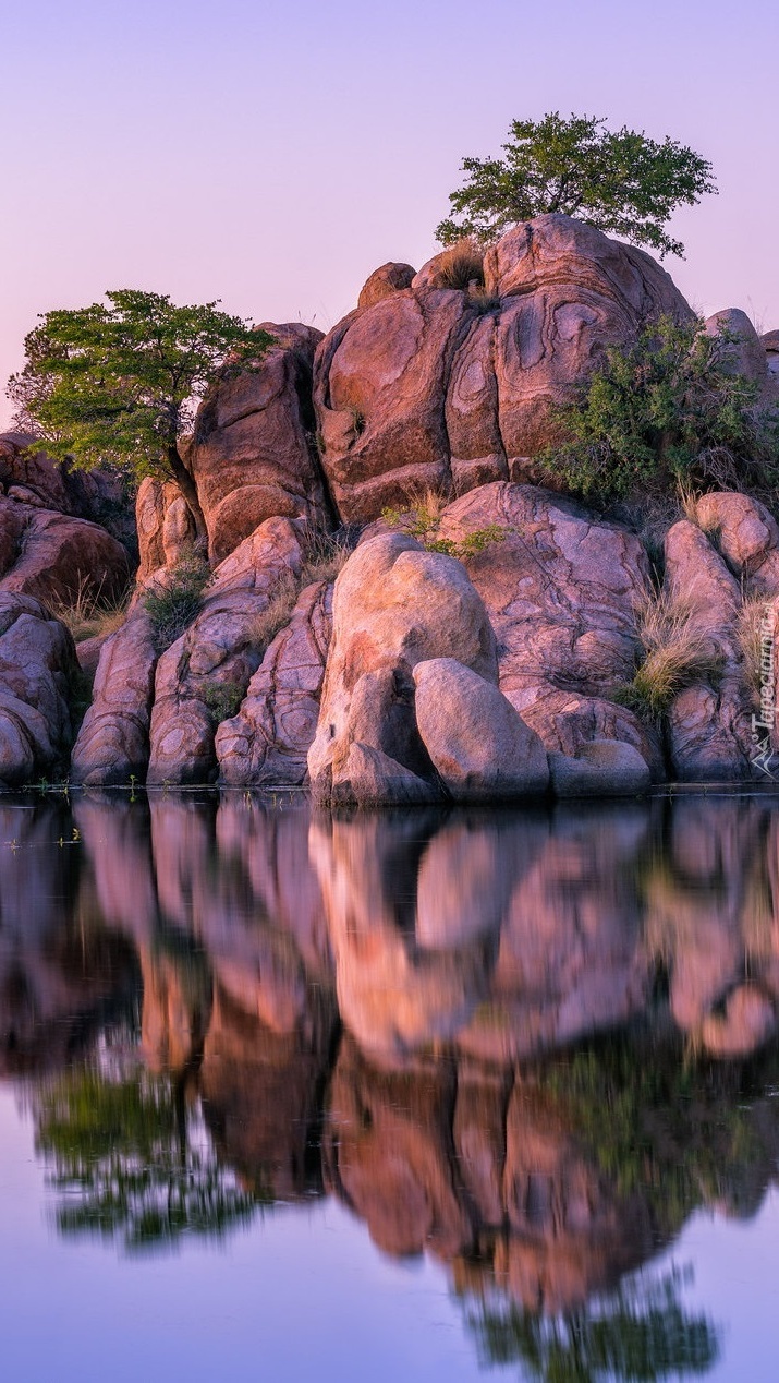 Edytor tapety: Odbicie skał i drzew w jeziorze
