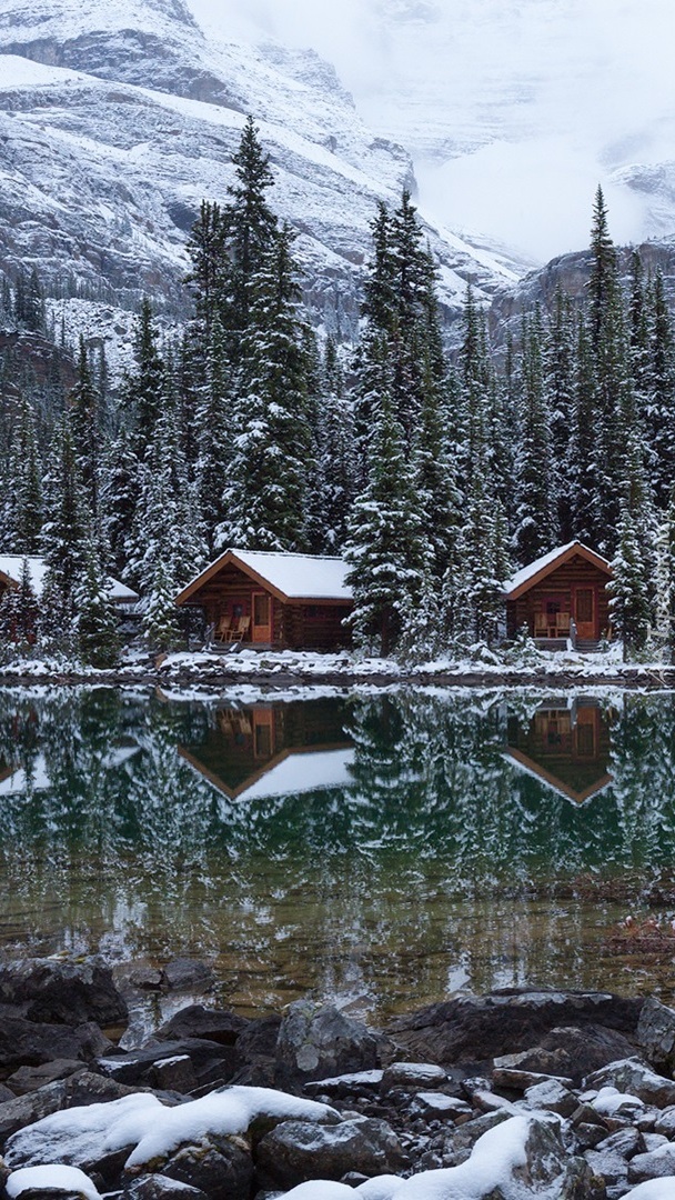 Edytor tapety: Domki pośród drzew nad jeziorem