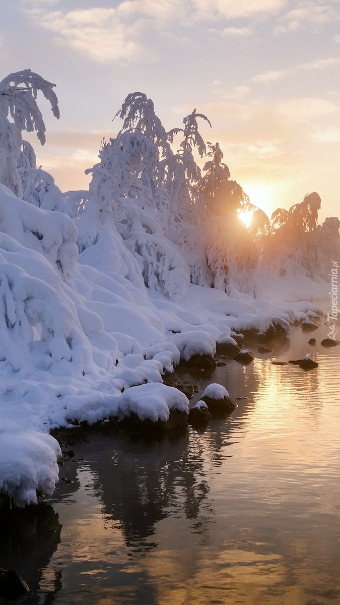 Edytor tapety: Ośnieżone drzewa nad jeziorem