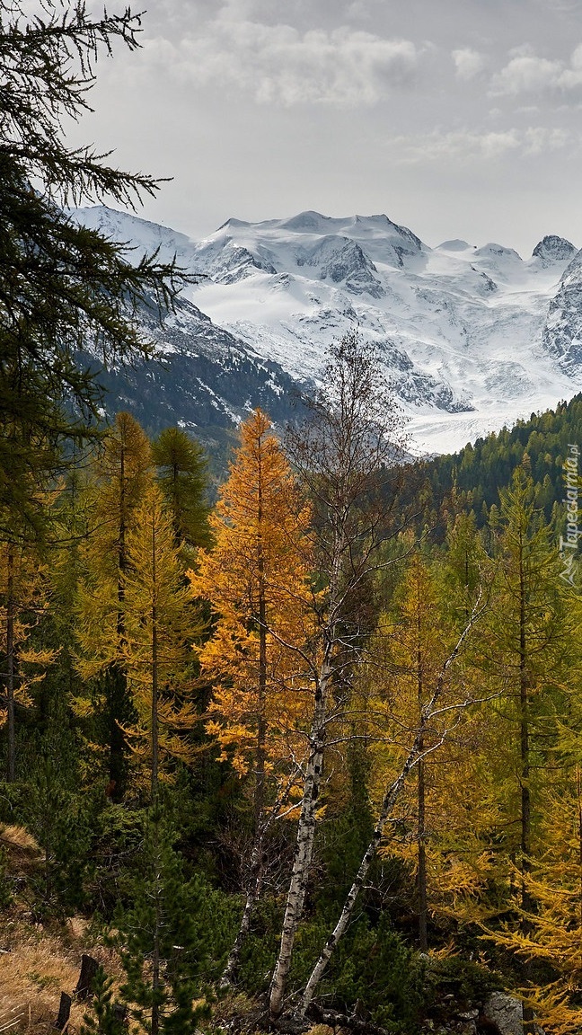 Edytor tapety: Pożółkłe drzewa na tle ośnieżonych gór