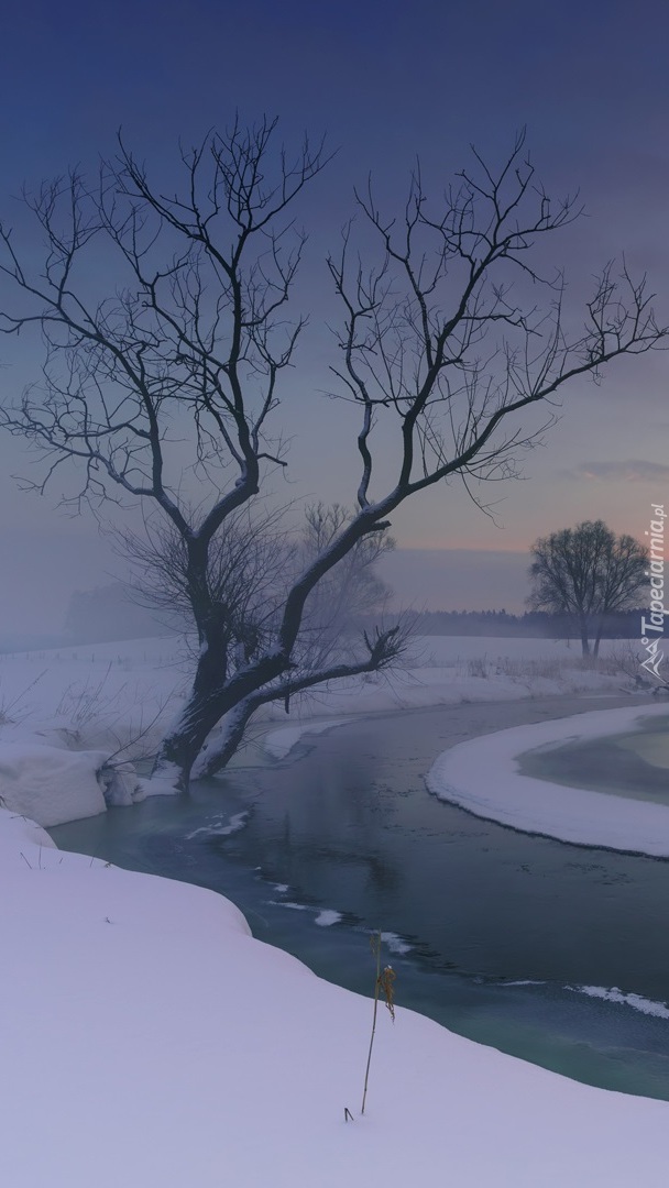 Edytor tapety: Drzewa nad zamgloną rzeką