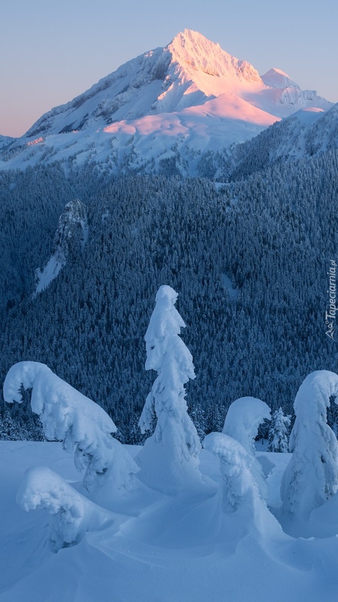 Edytor tapety: Ośnieżone drzewa na tle gór