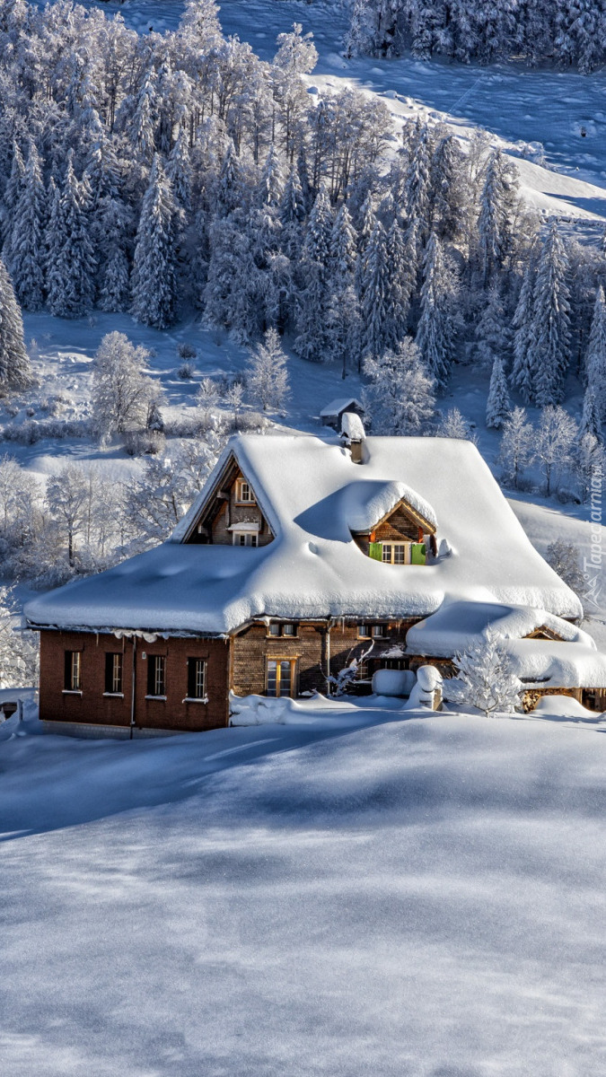 Edytor tapety: Ośnieżony śniegiem dom w górach