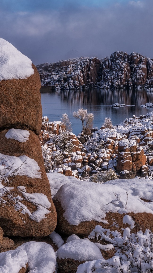 Edytor tapety: Jezioro pośród ośnieżonych skał