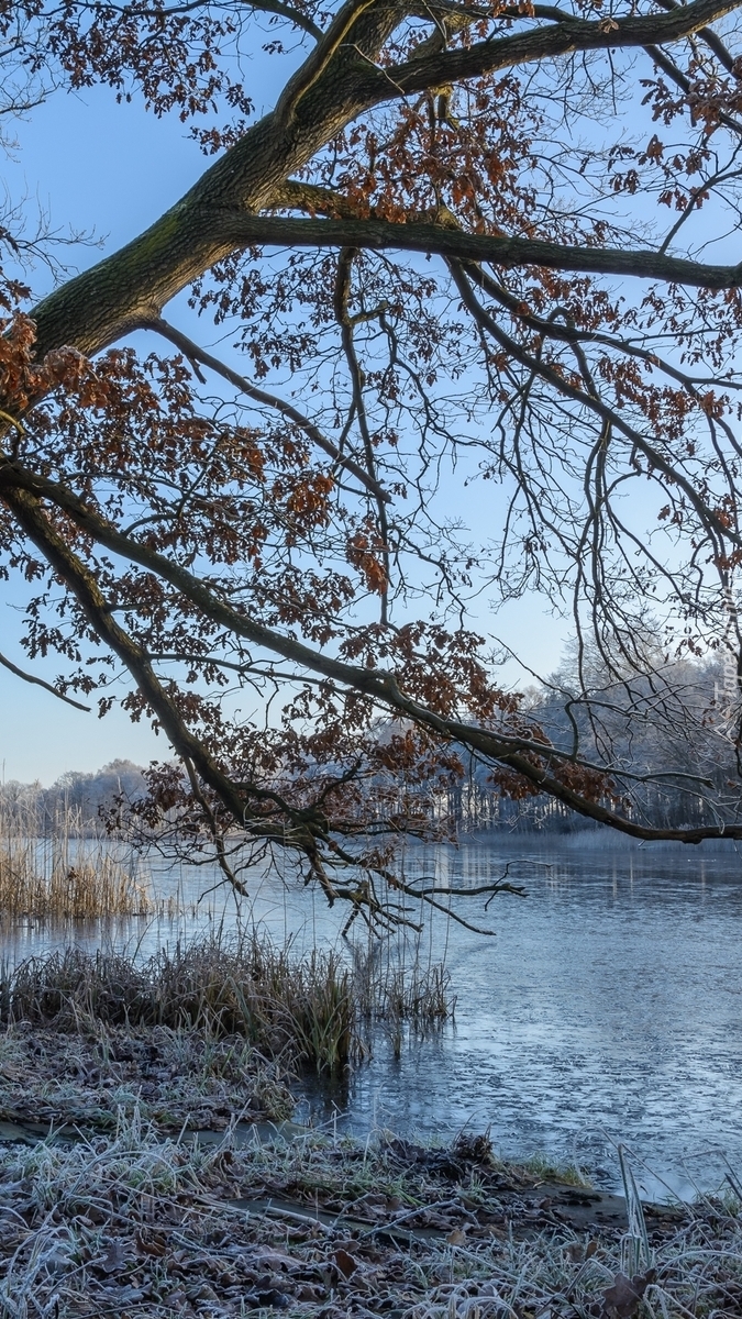 Edytor tapety: Oszronione drzewo i trawa nad rzeką
