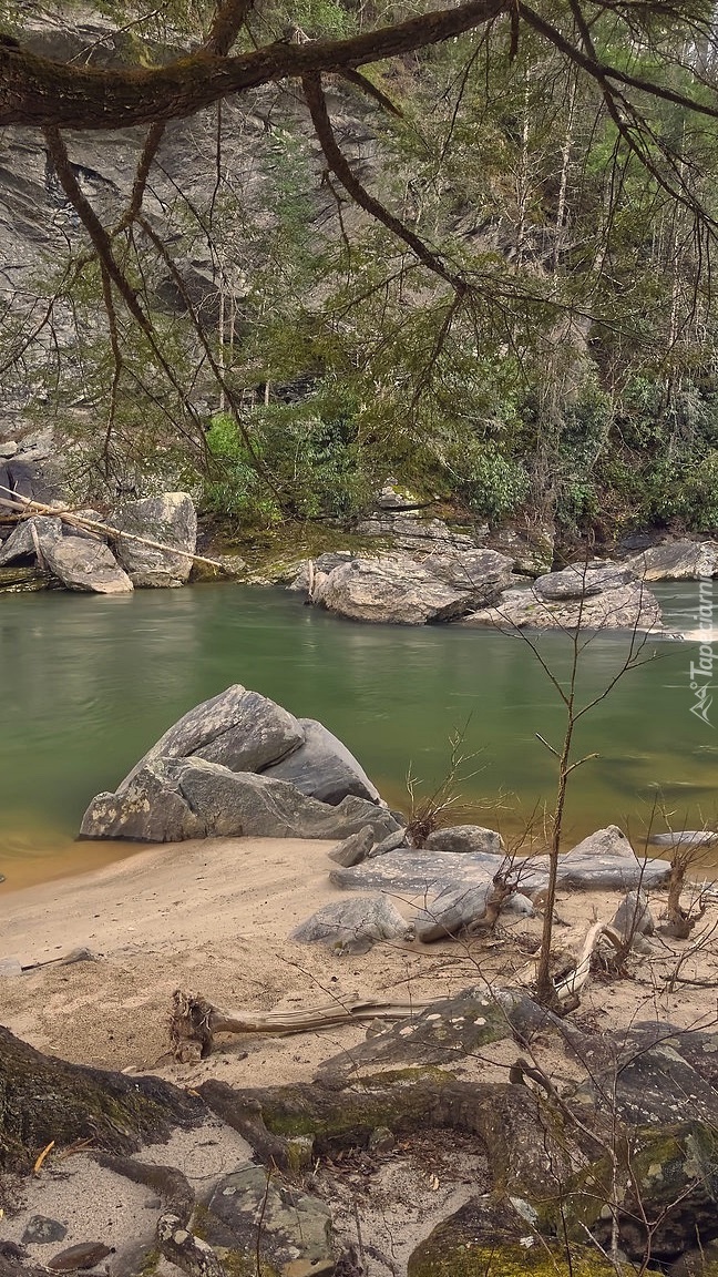 Edytor tapety: Skały i drzewa nad rzeką