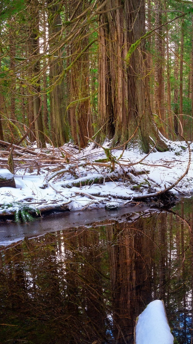 Edytor tapety: Drzewa w śniegu nad rozlewiskiem