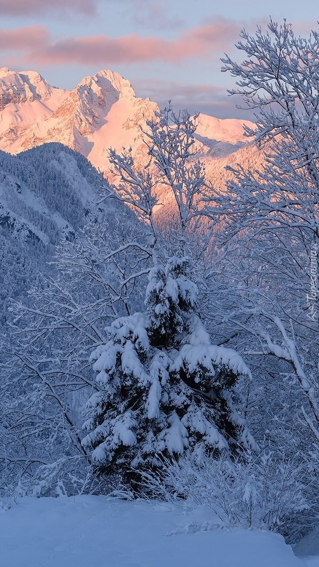 Edytor tapety: Ośnieżone drzewa na tle rozświetlonych gór