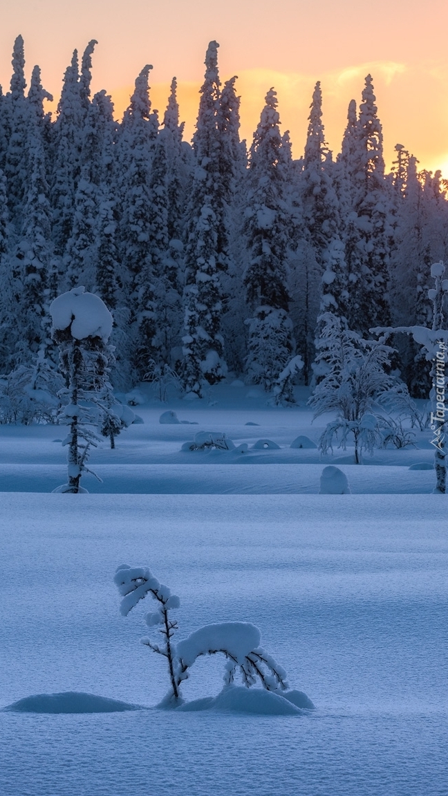 Edytor tapety: Zachód słońca nad zaśnieżonym lasem
