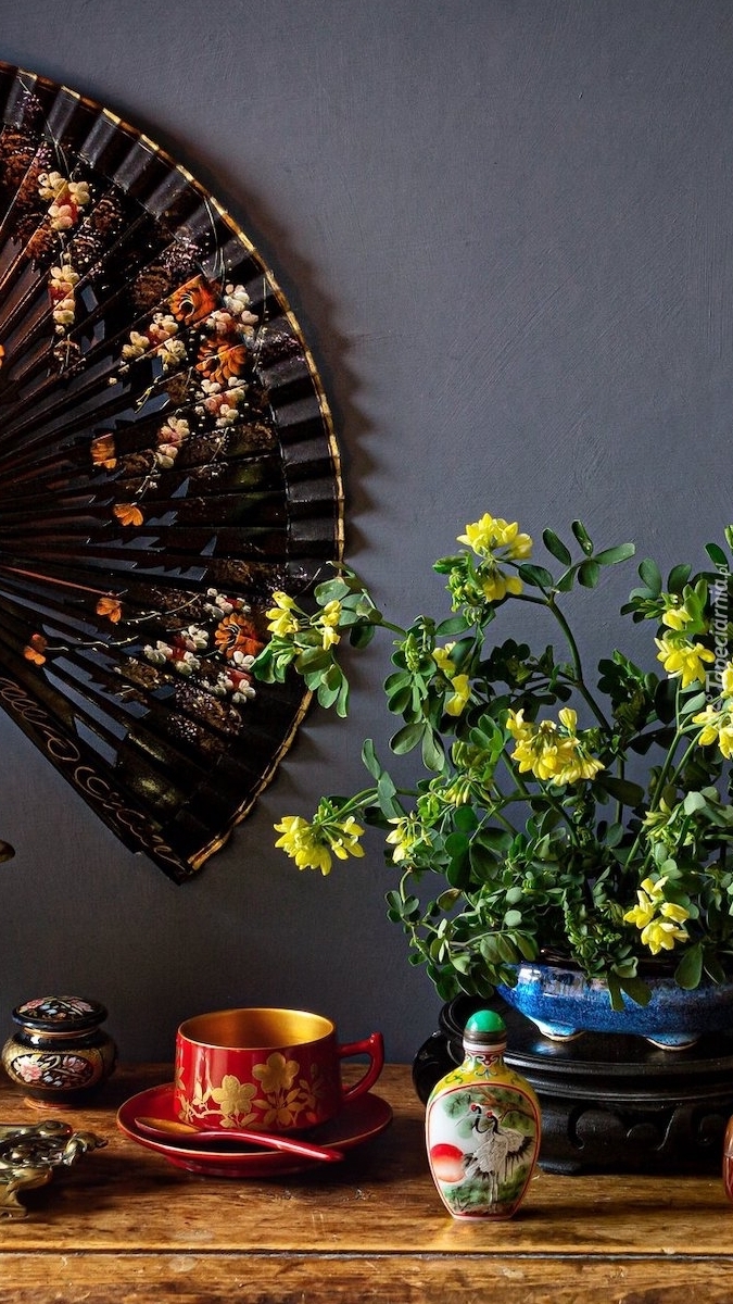 Edytor tapety: Wachlarz na ścianie obok kwiatów cieciorki