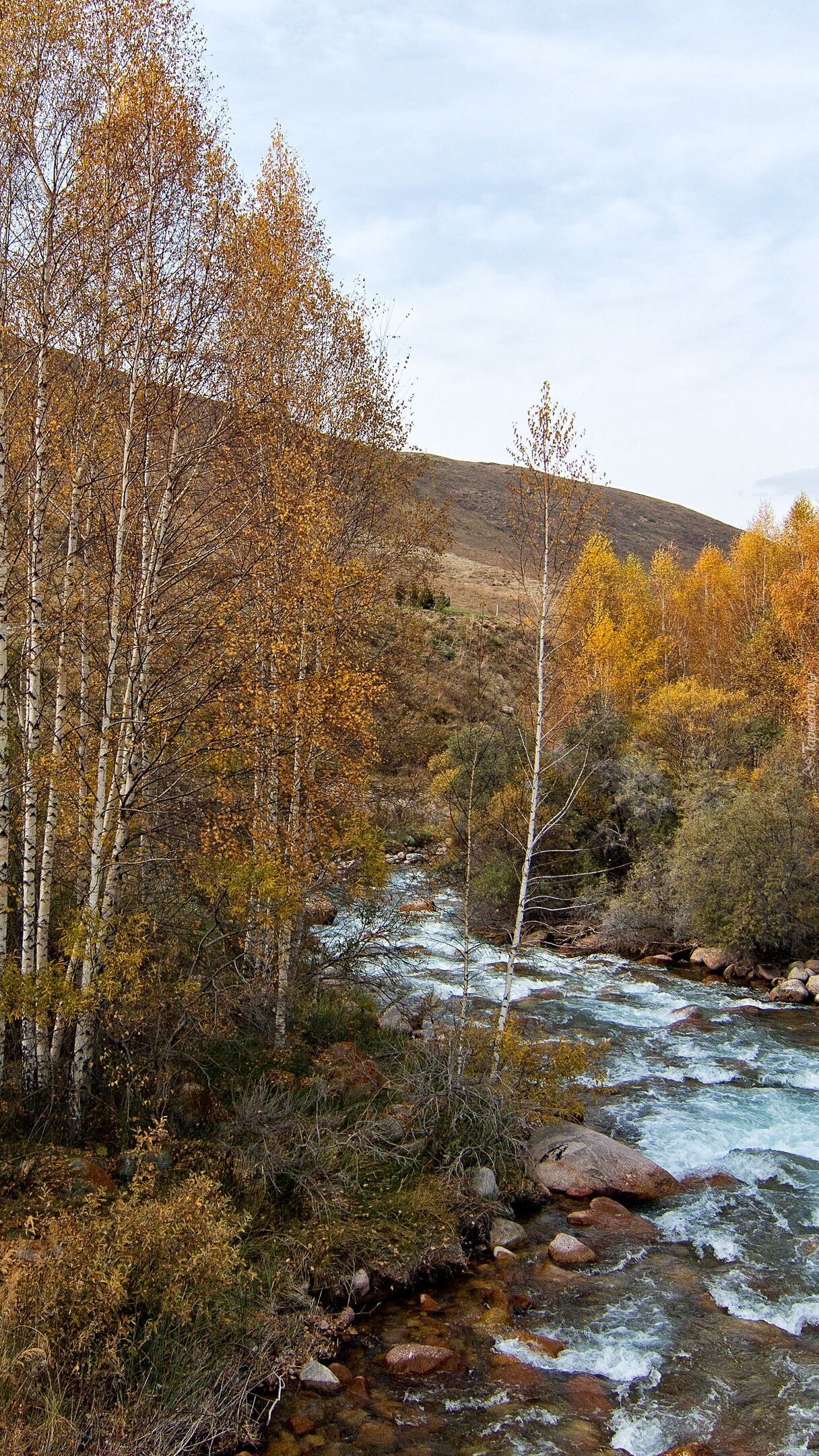 Edytor tapety: Brzozy nad kamienistą rzeką
