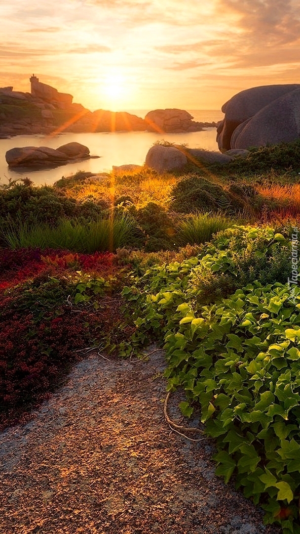 Edytor tapety: Kolorowe rośliny i głazy nad jeziorem