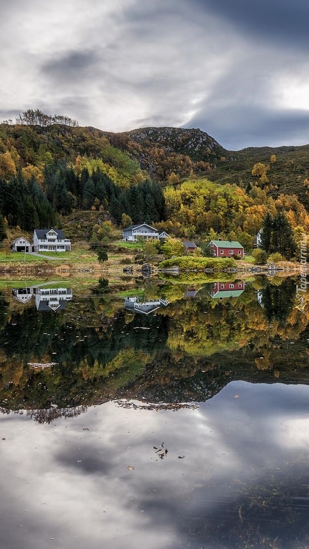 Edytor tapety: Domy i jesienne drzewa nad jeziorem