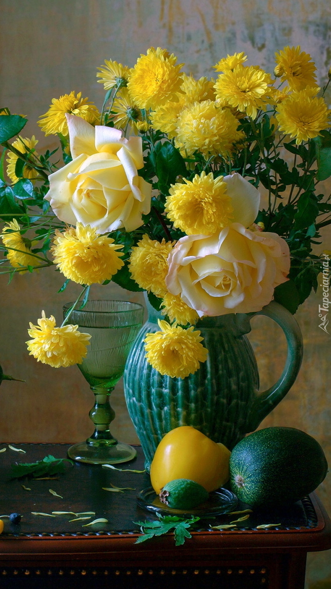 Edytor tapety: Bukiet róż i chryzantem w dzbanku
