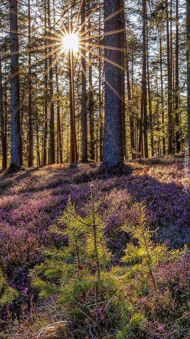 Edytor tapety: Rozświetlone wrzosy pod drzewami