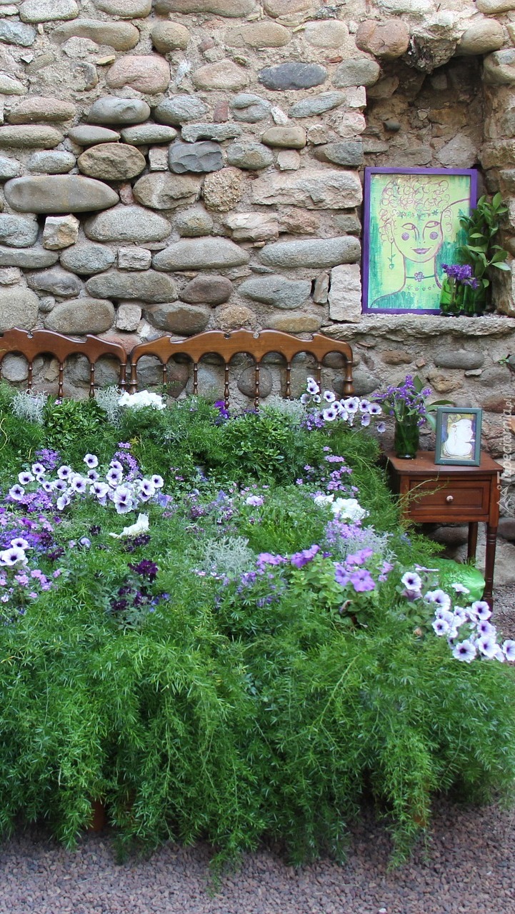 Edytor tapety: Łóżko zasłane kwiatami w ogrodzie