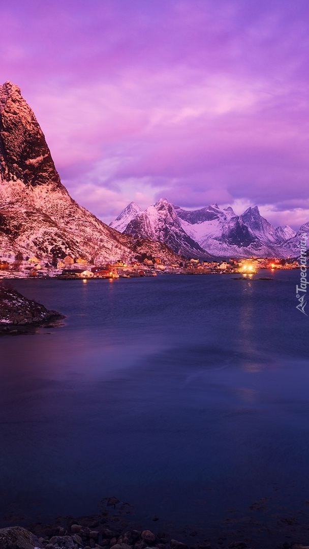 Edytor tapety: Oświetlona wioska Reine i ośnieżone góry