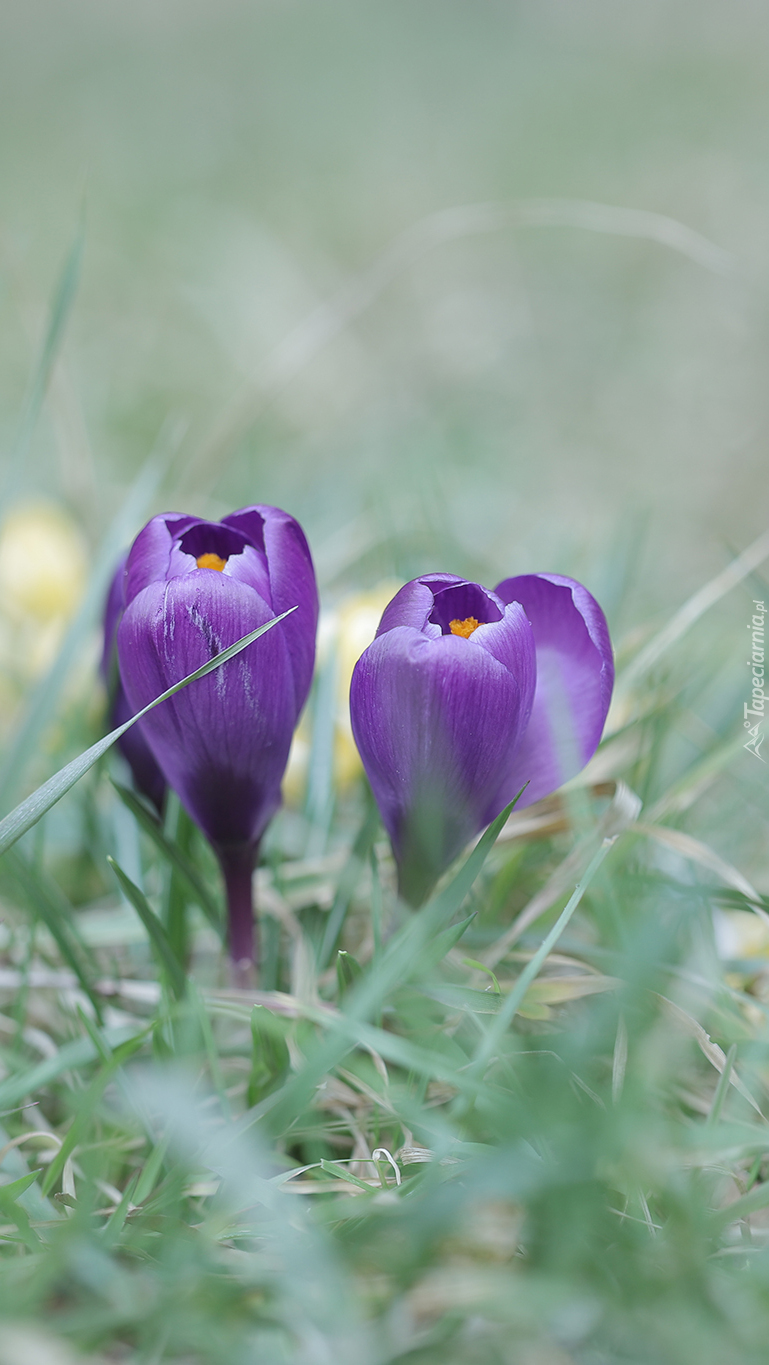 Edytor tapety: Dwa fioletowe krokusy w trawie