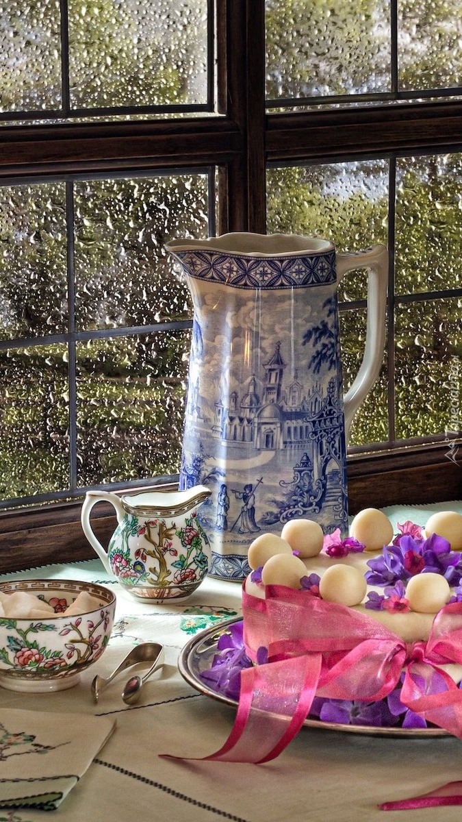 Edytor tapety: Dzbanek i tort przy oknie