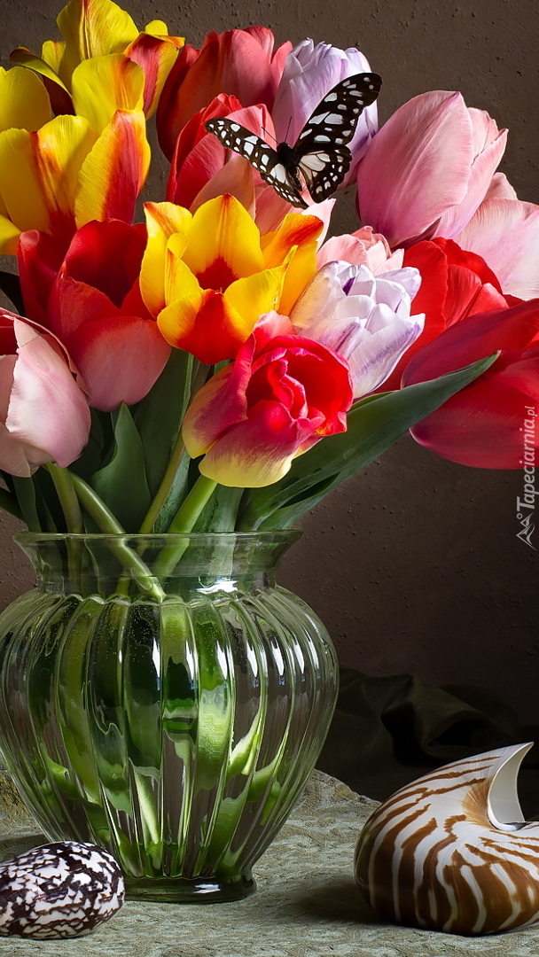 Edytor tapety: Kolorowe tulipany w szklanym wazonie