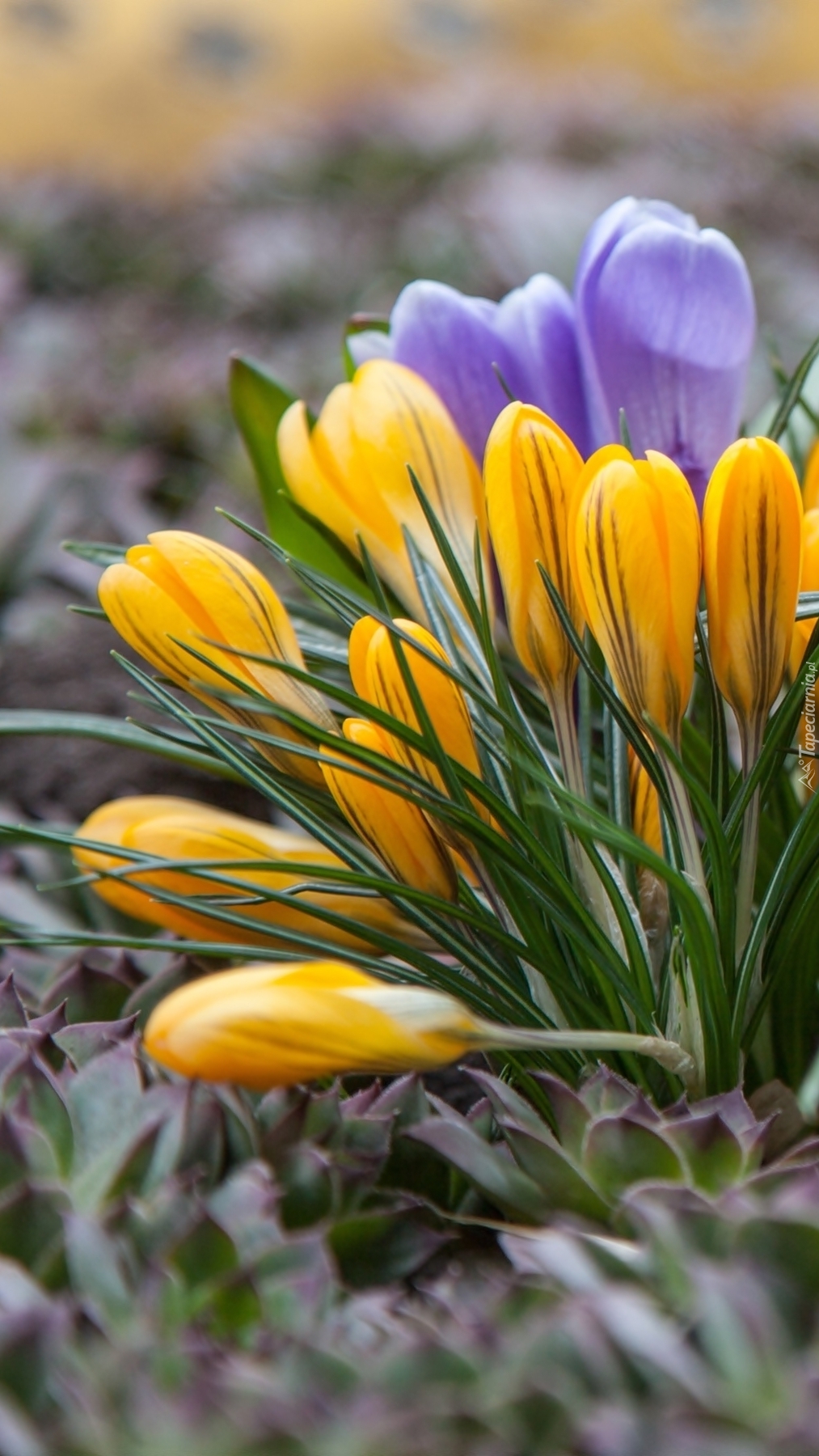 Edytor tapety: Żółte i fioletowe krokusy w trawie